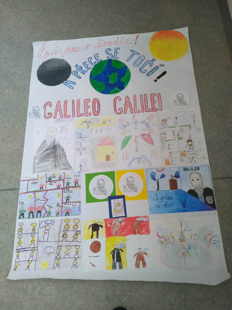 Navštívili jsme divadelní představení Hvězdný prach. Na předcházející hodinu českého jazyka jsme si připravili referáty o Galileu Galileovi, protože jsme věděli, že hra bude o něm.