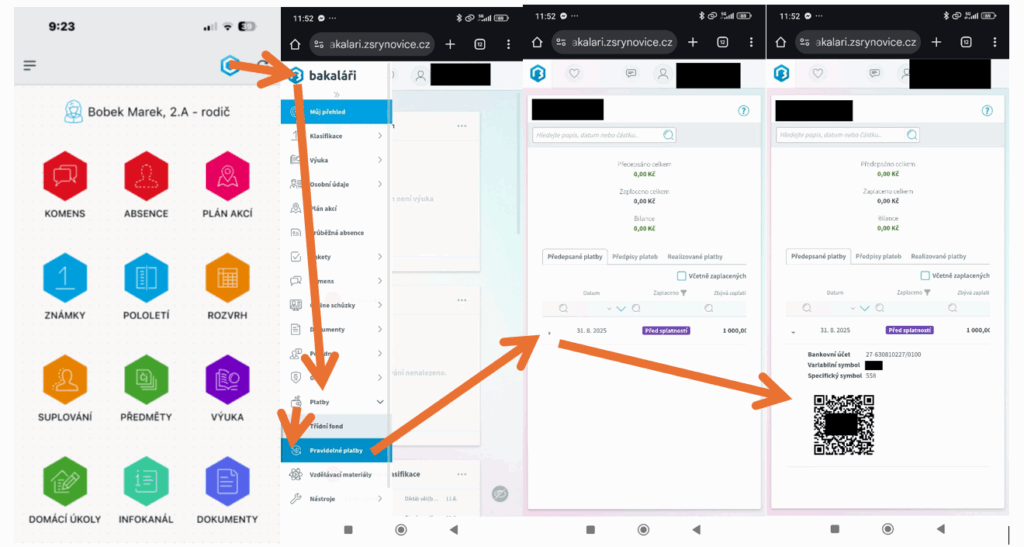 - Pokud používáte mobil, v aplikaci Bakaláři klikněte na odkaz „Otevřít ve webovém prohlížeči“ a tam si najděte Platby – Pravidelné platby.