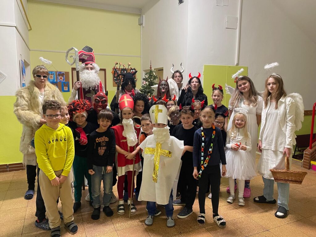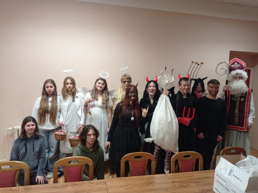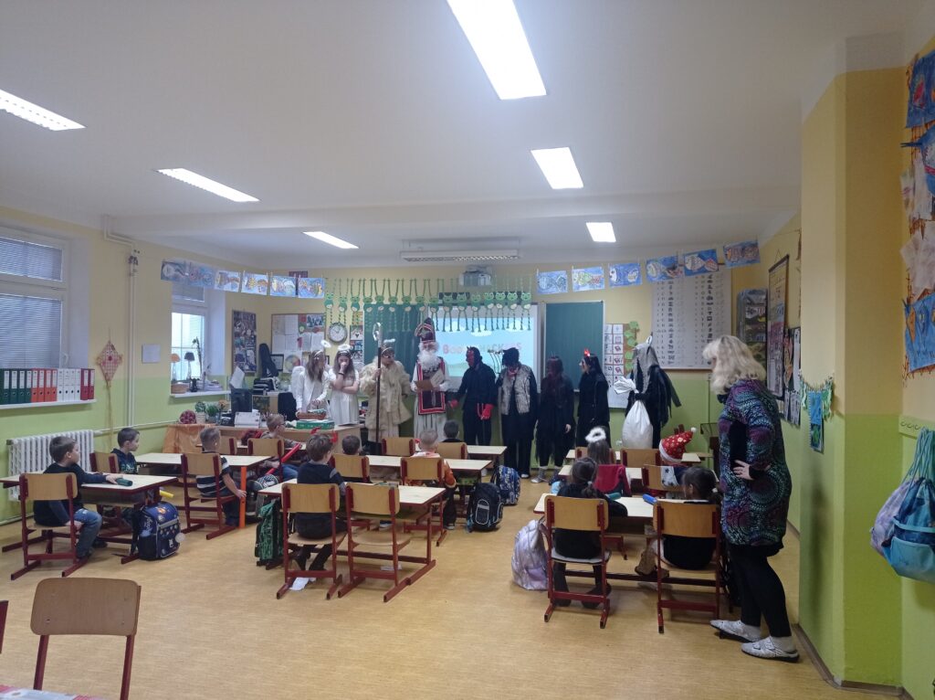 V pátek 5. prosince jsme se jako 9. třída proměnili na Mikuláše, anděly a čerty a vyrazili jsme na 1. stupeň. Rozdávali jsme dětem odměny, dávali malé úkoly a kontrolovali, kdo byl hodný a kdo občas trochu zlobil.